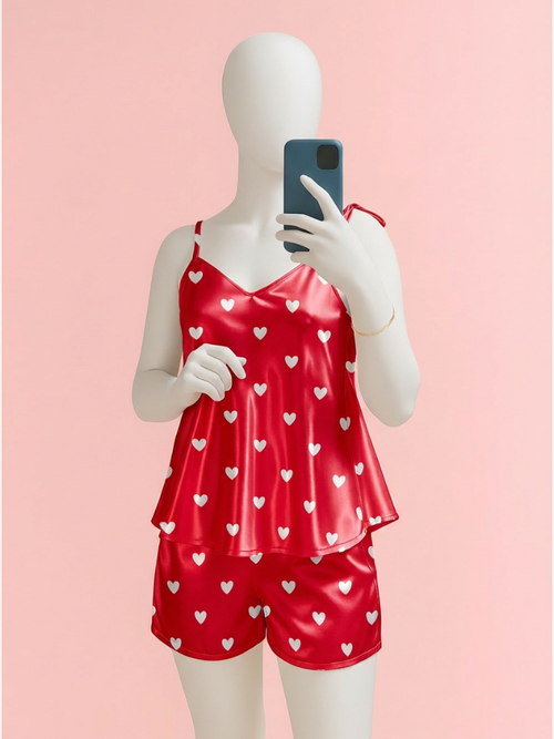 تاپ و شلوارک ساتن قلبی قرمز کلوش N01